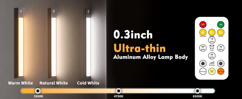 - 【3 Color Temperature & 4 Timers & 6 Levels Dimmable Under Cabinet Lights with Remote】— These under cabinet led lighting have 3 colors(warm white/natural white/cold white). With 4 time settings of 15Min/30Min/45Min/60Min, you can also adjust the brightness from 10% to 100% by pressing the button on the remote control, which can be operated within 16ft.