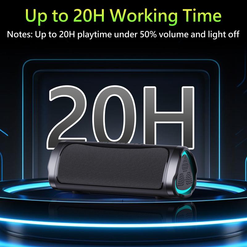 [Long-lasting Playtime & Extended Bluetooth Connectivity] This speaker delivers up to 20 hours of playtime per charge when used at 50% volume with lights off. It uses Bluetooth 5.3 for an extended wireless range, reaching up to 33 feet from your device. A simple button press turns off the speaker's multicolor lights to save battery and match your needs. Note that actual playtime may vary based on volume level audio content and usage.